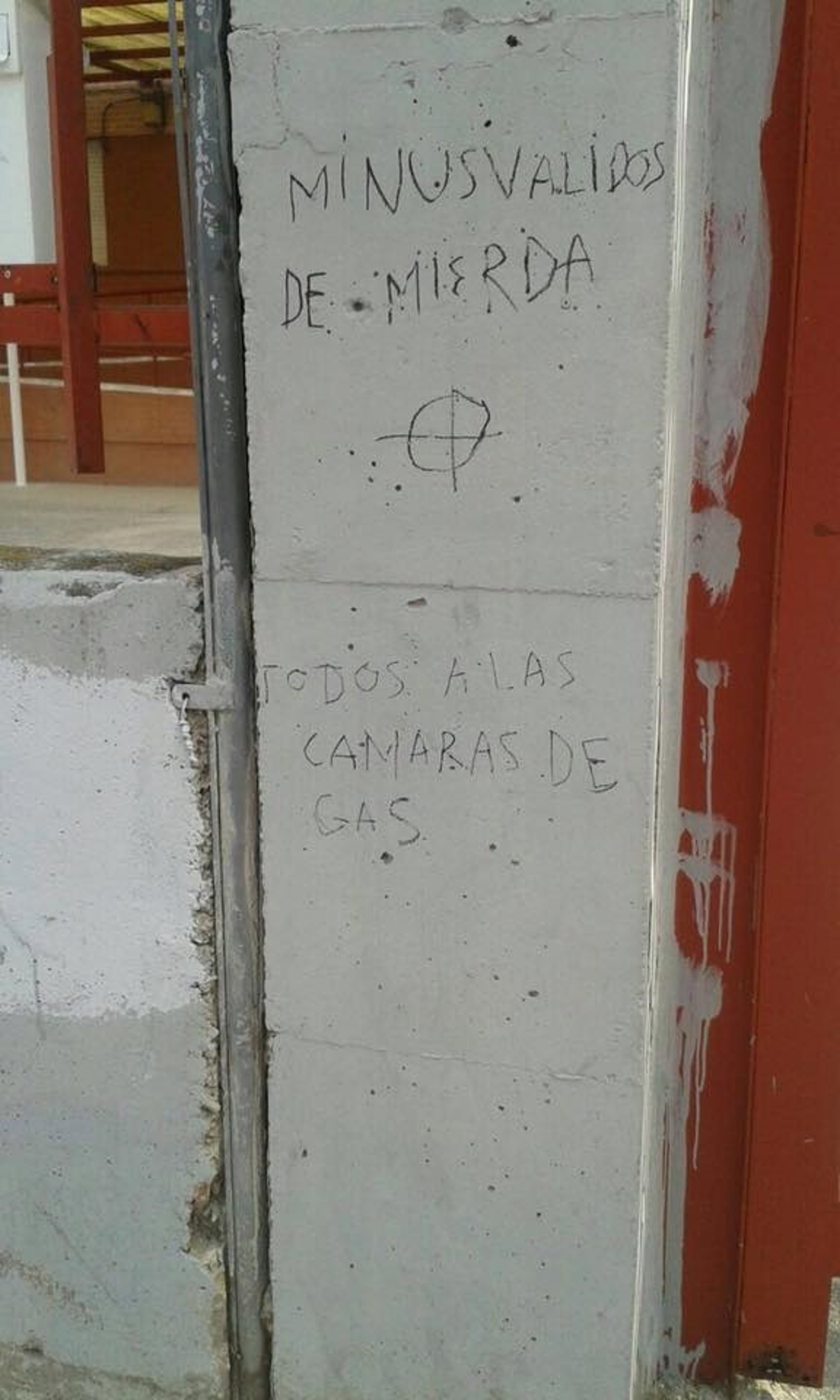 La dirección del centro de Educación Especial Juan XXIII de Fuenlabrada ha puesto en conocimiento de la Policía y el Consistorio de la localidad unas pintadas insultantes y vejatorios que se encontraron en la mañana del lunes en los exteriores como 'Minusválidos de mierda', 'Todos a la cámara de gas' y 'Muerte a los niños en silla de ruedas'.