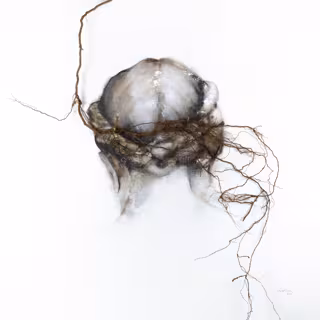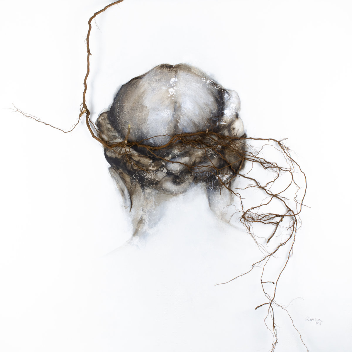 Creadas con lápiz, óleo y raíz de frambuesa que nace de su cabeza, estas mujeres enraizadas son un símbolo con múltiples lecturas e interpretaciones. "Con ese complemento vivo que se mueve y que indefectiblemente cambiará con el tiempo, la obra se hace mortal sin dejar de ser eterna", subraya.