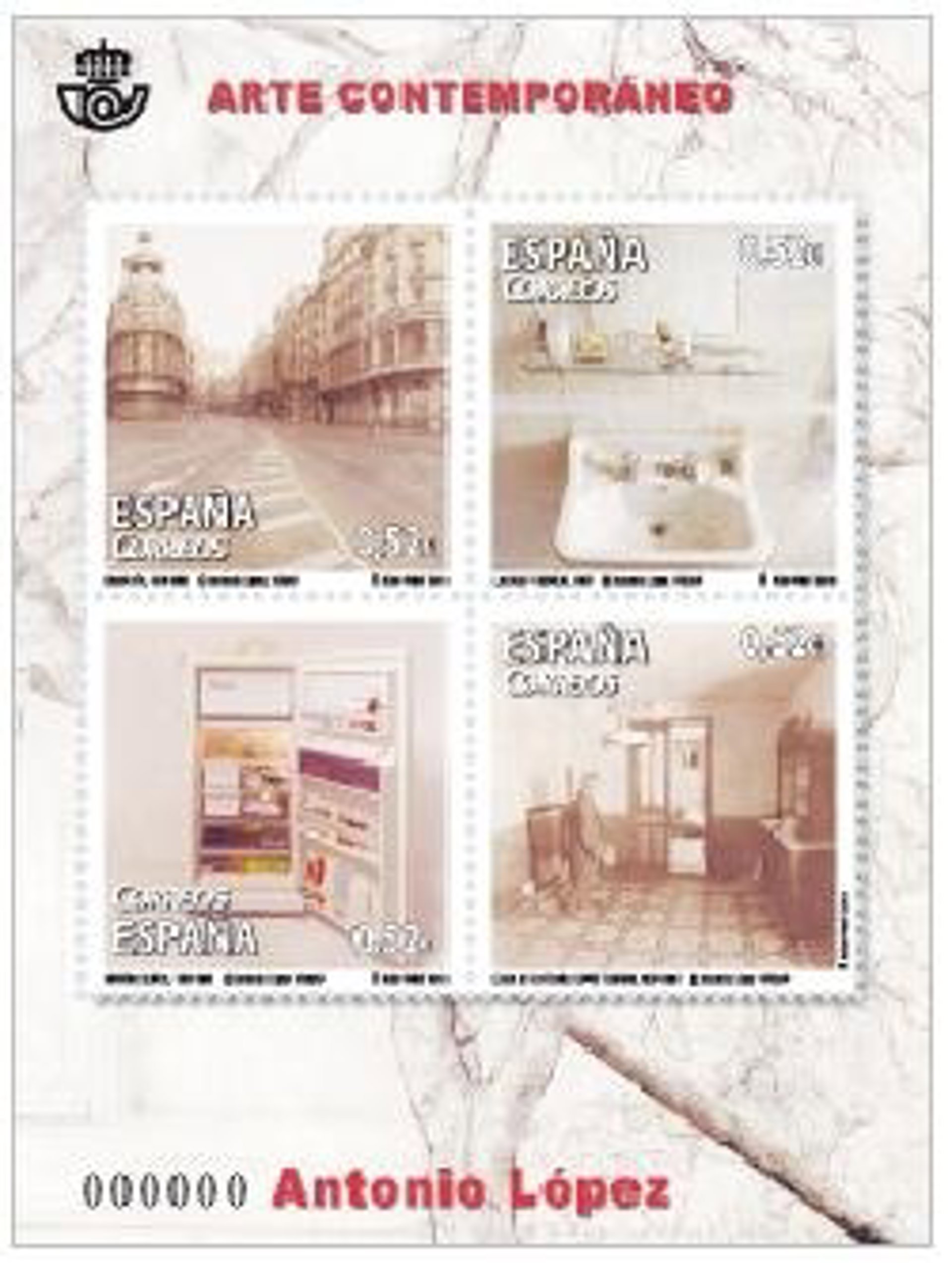 Cuatro de las obras más representativas del pintor y escultor manchego Antonio López, reflejadas en sendos sellos, componen una hoja bloque dedicada al Arte Contemporáneo que Correos pone en circulación este lunes.