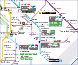 --> A CABECERAS EN ESTACIÓN SUR-MÉNDEZ ÁLVARO: conexión con C-5 (Móstoles El Soto/Atocha/Fuenlabrada/Humanes) y C-10 (Villalba/Príncipe Pío/Atocha/Recoletos/Chamartín/Aeropuerto T4) de Cercanías y Línea 6 de Metro (Circular):