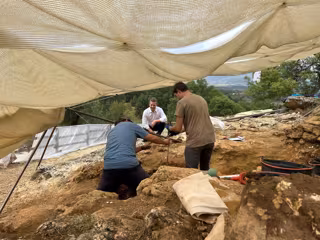 Al fondo, el consejero de Cultura, Turismo y Deporte, Mariano de Paco, observa los trabajos de exvacación en el Valle de los Neandertales de Pinilla del Valle durante una visita al lugar. - COMUNIDAD DE MADRID