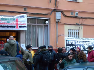 Los concentrados frente al portal, ante una discreta presencia policial, han colocado pancartas contra el desahucio de Francisco, de 52 años, que pidió una hipoteca de 205.000 euros en 2007 a una entidad bancaria, pero al año siguiente fue víctima de un atraco por lo que estuvo ocho meses de baja y posteriormente perdió su empleo como jefe de sala en un restaurante de Madrid, según ha explicado.