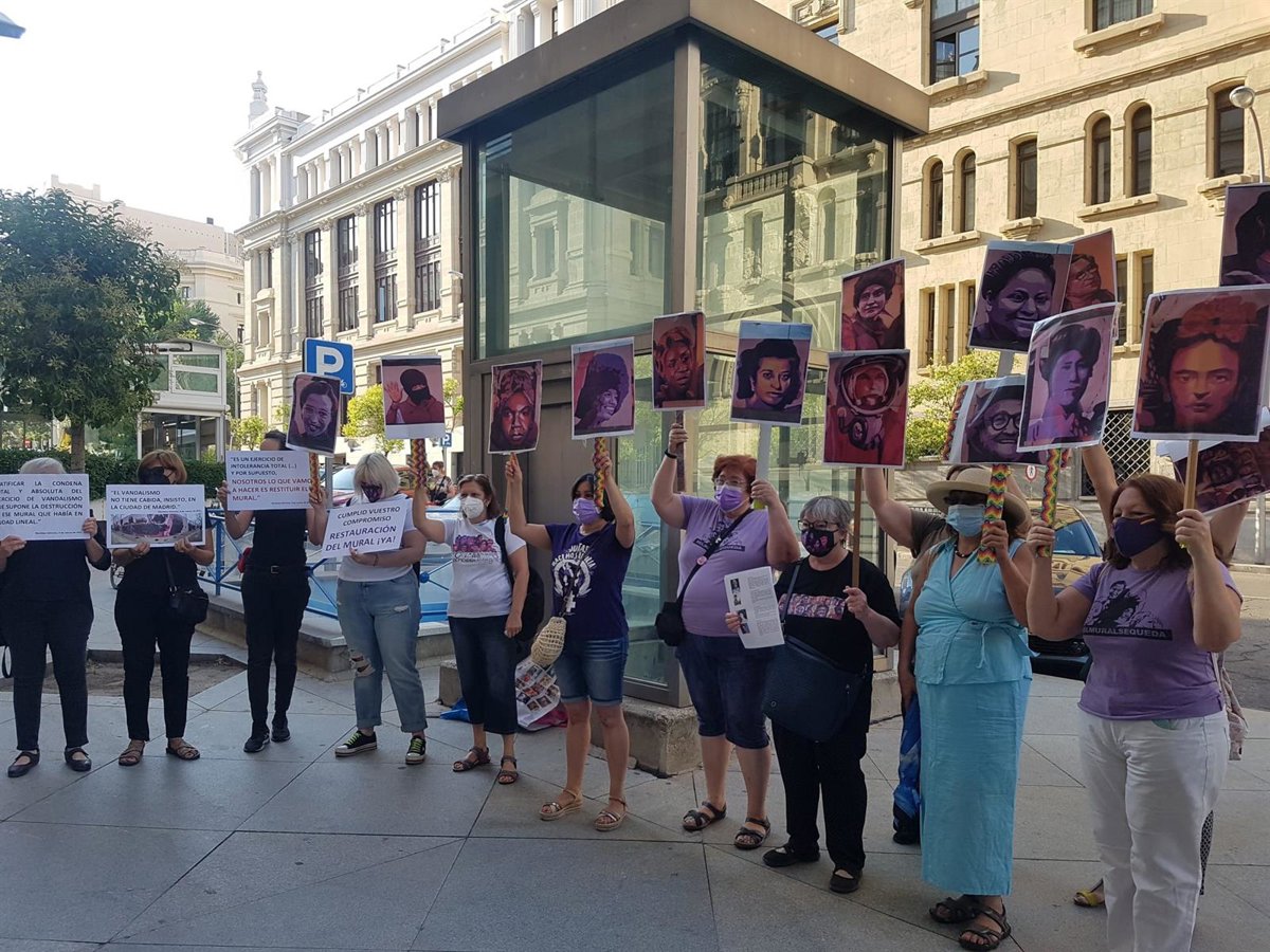 La plataforma en defensa del mural de Ciudad Lineal se ha manifestado este miércoles ante el Pleno de Cibeles para exigir su restauración, tal y como prometió el alcalde de Madrid, José Luis Martínez-Almeida, después de haber sido vanzalizado el 8 de marzo, el Día Internacional de las Mujeres.