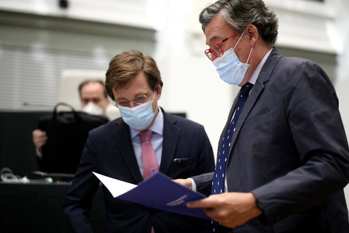 El alcalde de Madrid, José Luis Martínez Almeida (i), durante la sesión plenaria en el Palacio de Cibeles, sede del Ayuntamiento de Madrid. - Óscar Cañas - Europa Press