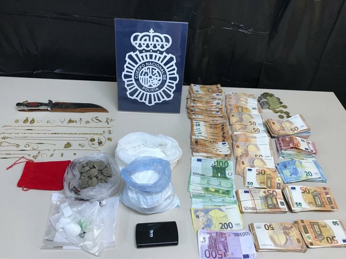 Con la debida autorización judicial, realizaron un registro de la vivienda en la que se encontraron 25.600 euros en efectivo, una báscula de precisión, 180 gramos de heroína, 50 gramos de hachís, 20 gramos de cocaína, cocaína en roca, un machete y productos químicos para corte de sustancias estupefacientes.