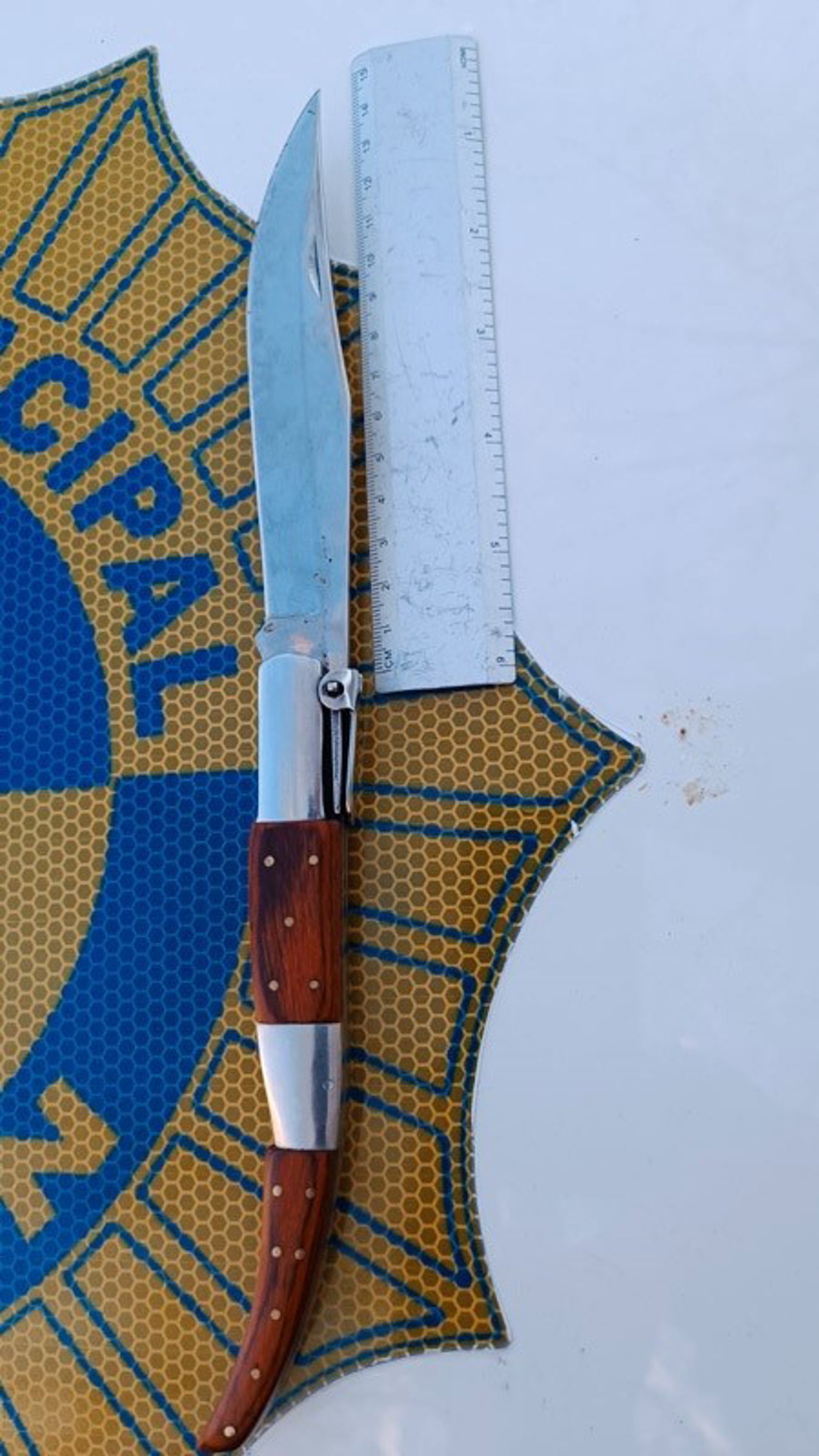 La Policía Municipal de Alcorcón ha incautado este fin de semana un machete-navaja, de unos 15 centímetros, así como también un bastón modificado con extremo metálico, que eran portadas por el conductor de un vehículo, en la calle Infantas.