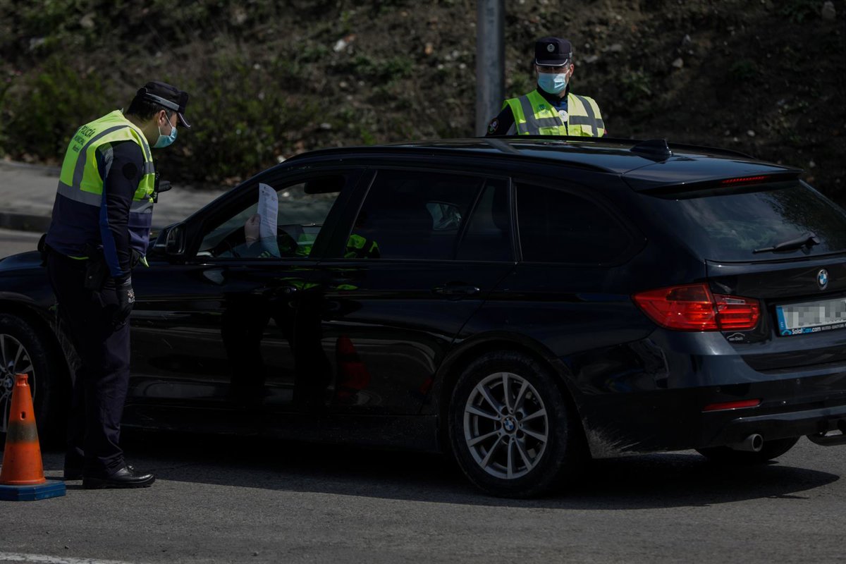 Dos agentes de la Policía Municipal protegidos con mascarillas piden a un conductor el justificante que le permite su salida de casa en un control policial de tráfico en el barrio madrileño de Vallecas. - Jesús Hellín - Europa Press