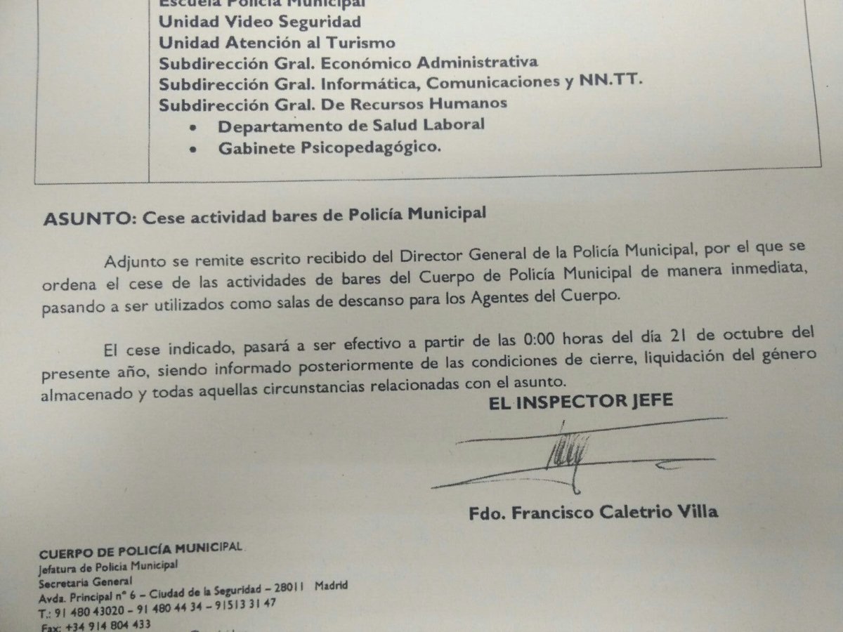 Hace unos días el inspector jefe de la Policía Municipal, Francisco Caletrio, remitió un escrito del director general, Andrés Serrano, que ordenaba "el cese de las actividades de los bares del Cuerpo de la Policía Municipal de manera inmediata, pasando a ser utilizados como salas de descanso para los agentes".