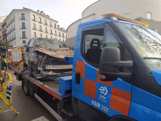 La Policía Municipal de Madrid está retirando esta mañana los vehículos dañados por los cascotes del edificio que explotó ayer por la tarde en la calle Toledo 98 por un escape de gas, algunos de ellos gravemente dañados.