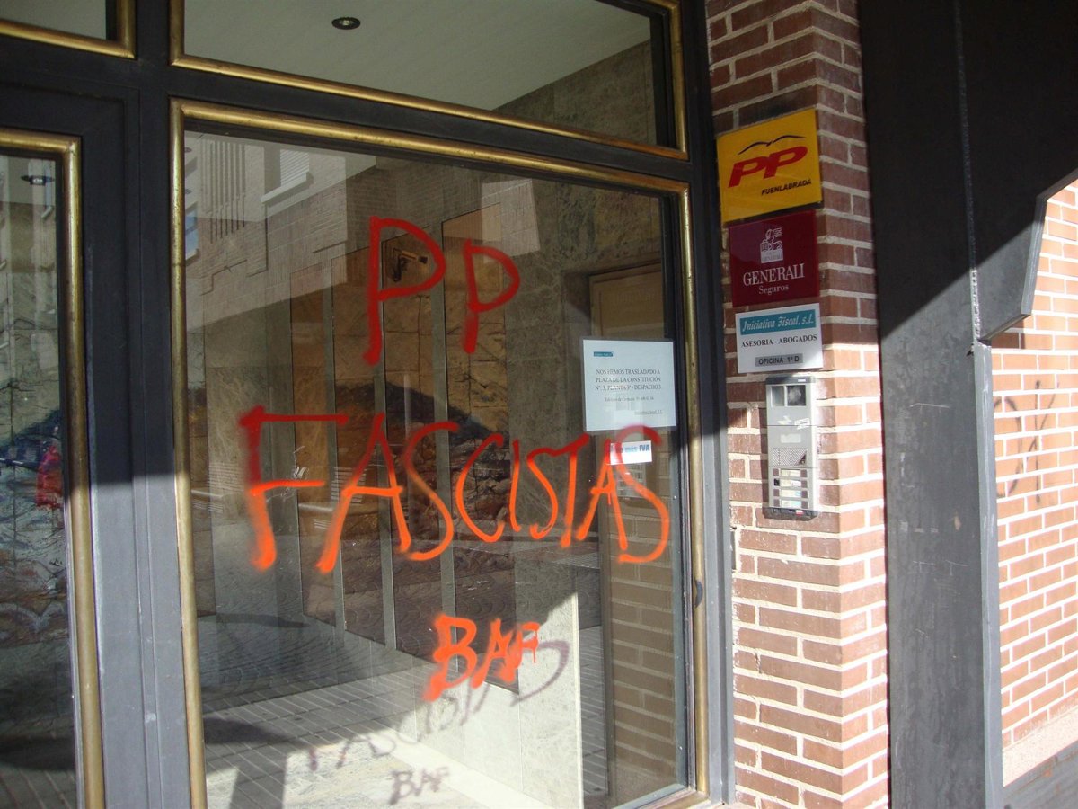 El Partido Popular de Fuenlabrada ha denunciado en la Comisaría de la localidad la aparición de una pintada de "dimensiones considerables" en el portal de su sede local en la que se puede leer "PP fascistas" que han calificado de "acto en contra de la libertad". Los populares aseguran que la pintada "lleva la firma de las Bases Antifascitas de Fuenlabrada" y se realizó con spray de color rojo, similar al utilizado para los grafitis convencionales.