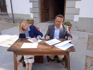 Pilar Baos (Vox) y Juan Pedro Izquierdo (PP) firman el acuerdo de Gobierno entre ambas formaciones para el Ayuntamiento de Villaviciosa de Odón. - PP VILLAVICIOSA