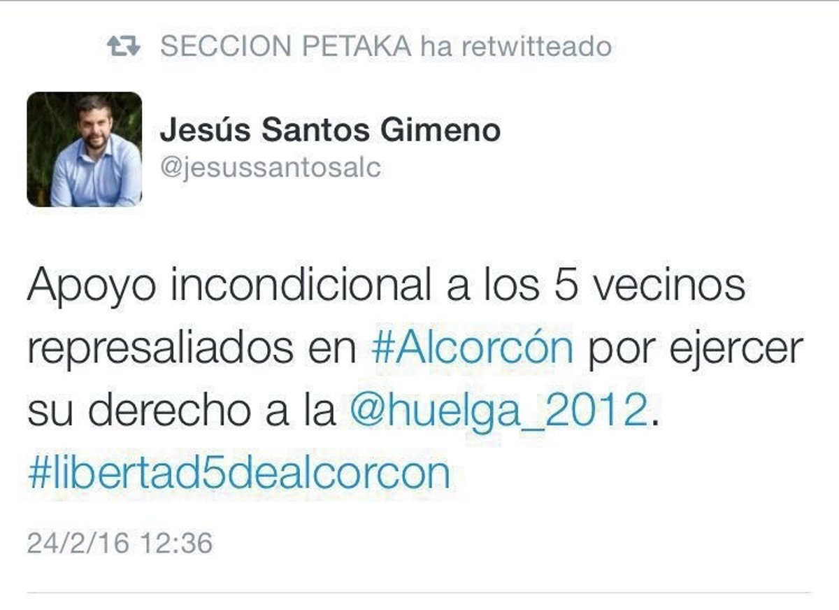 El Grupo Popular de Alcorcón ha exigido hoy la dimisión "fulminante" del portavoz de Ganar Alcorcón, Jesús Santos, por apoyar "incondicionalmente" a cinco vecinos acusados presuntamente de agredir a policías durante la huelga general del 14-N.