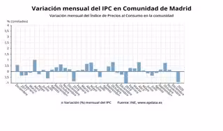 El Índice de Precios de Consumo (IPC) de la Comunidad de Madrid bajó un 0,9 por ciento el pasado mes de enero respecto al mes anterior, mientras que su tasa interanual se sitúa un 0,9 por ciento, según datos difundidos este viernes por el Instituto Nacional de Estadística (INE), recogidos por Europa Press.