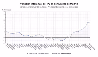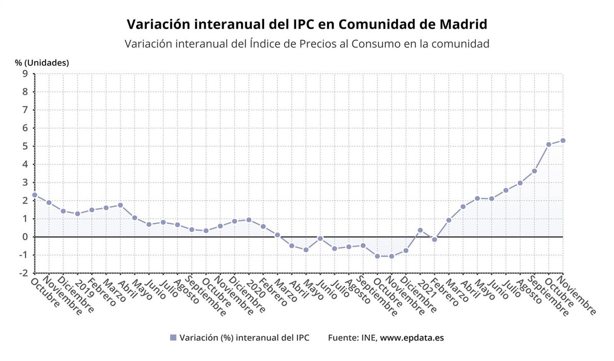 El Índice de Precios de Consumo (IPC) en la Comunidad de Madrid subió un 0,2% en noviembre en relación al mes anterior y un 5,3% en tasa anual, según los datos publicados este miércoles por el Instituto Nacional de Estadística (INE), incremento al que ha contribuido el alza de los precios en vivienda y el transporte.