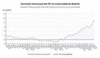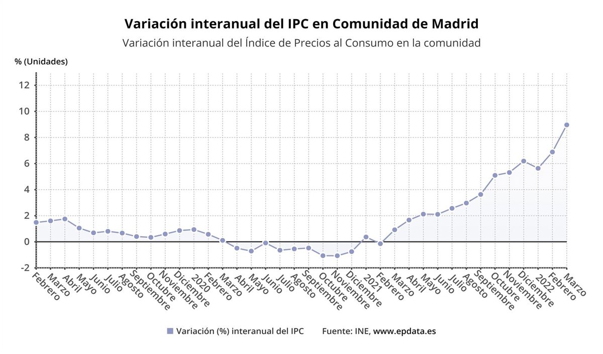 El Índice de Precios de Consumo (IPC) en la Comunidad de Madrid subió un 2,1% en marzo con relación al mes anterior y se disparó un 9% en términos interanuales, según los datos publicados este miércoles por el Instituto Nacional de Estadística (INE)