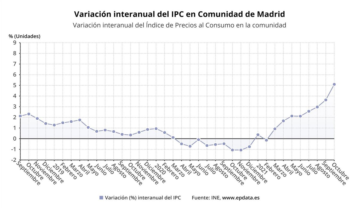 El Índice de Precios de Consumo (IPC) en la Comunidad de Madrid subió un 1,6% en octubre en relación al mes anterior y un 5,1% en tasa anual, según los datos publicados este viernes por el Instituto Nacional de Estadística (INE), incremento al que ha contribuido el alza de los precios en vivienda y el transporte.