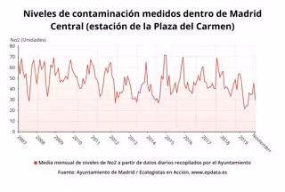 En Ecologistas, coincidiendo con la activación este jueves del protocolo anticontaminación, contrastan las 119 superaciones de los valores límite en 2015, entonces "sin protocolo, ni Madrid Central ni Plan A", con lo ocurrido el año pasado. Las superaciones de 2015 fueron "más que en todo 2019".
