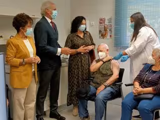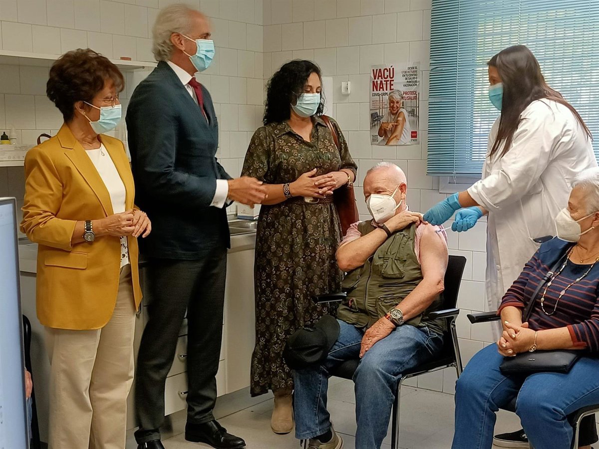 Pedro Cejudo y su mujer Paqui han sido unos de los primeros en recibir la doble administración de la vacuna en el centro de salud de Alameda de Osuna, donde se ha desplazado también el consejero de Sanidad de la Comunidad de Madrid, Enrique Ruiz Escudero.