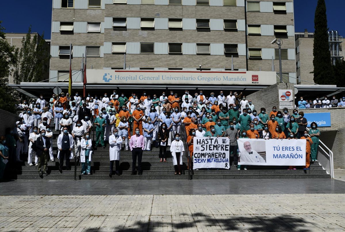 Profesionales sanitarios del Hospital Gregorio Marañón guardan un minuto de silencio en homenaje al médico especialista en nefrología e investigador del centro Alberto Tejedor. En Madrid (España), a 20 de mayo de 2020. - Óscar Cañas - Europa Press - Archivo