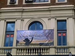 El Partido Socialista de Madrid (PSM) ha vuelto a colgar un cartel de película de la fachada de su sede en la plaza del Callao, en el que aparece la presidenta de la Comunidad de Madrid, Esperanza Aguirre, y la frase 'Adiós, condesa'.