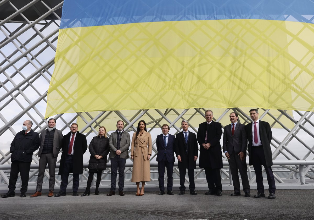El 'Puente de la Concordia', que conecta el desarrollo de Valdebebas con la Terminal 4 del aeropuerto Adolfo Suárez Madrid-Barajas, ha vestido este miércoles durante su inauguración la bandera de Ucrania en apoyo al pueblo ucraniano contra la invasión rusa.