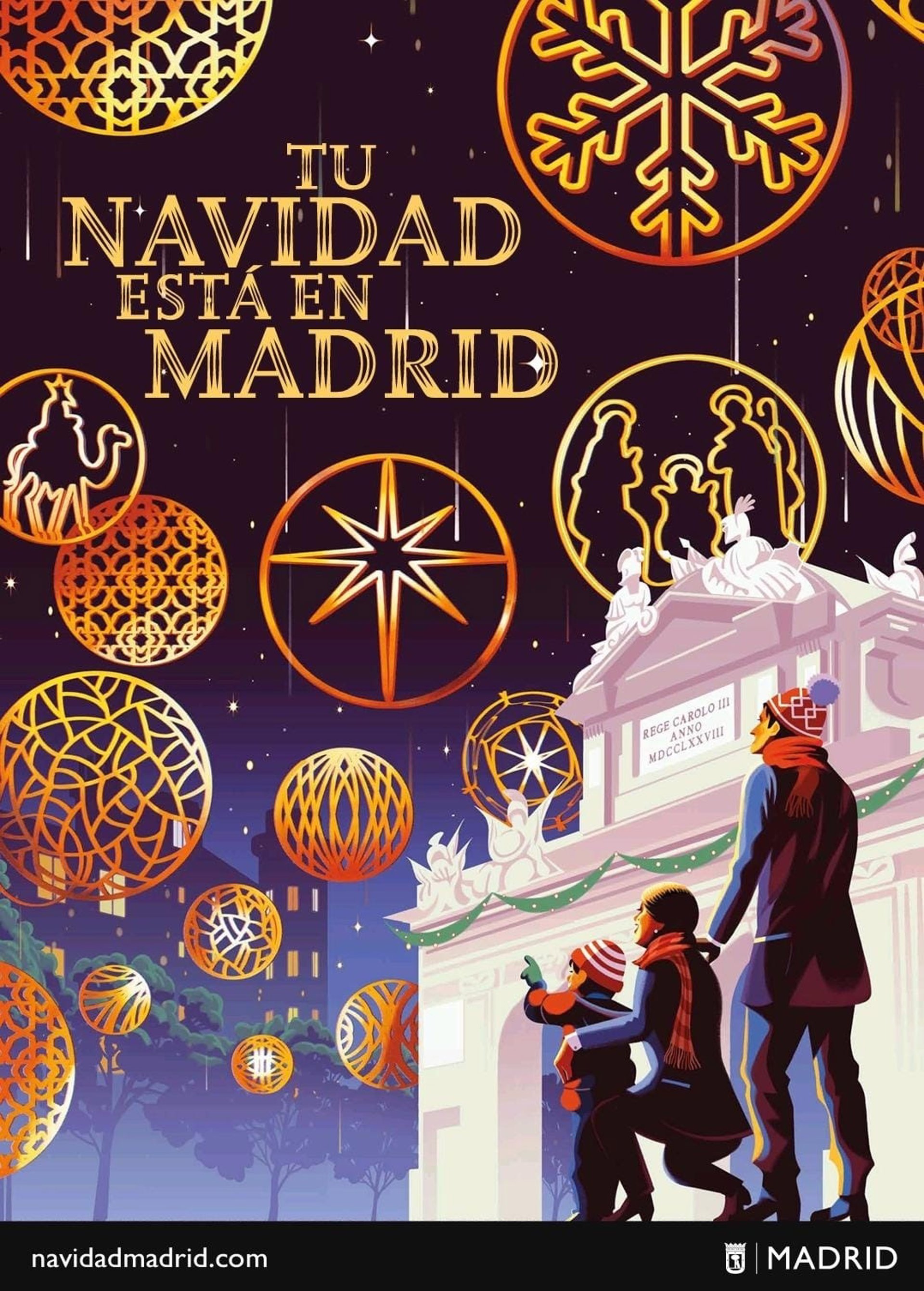 'Tu Navidad está en Madrid' es el lema que ha elegido el Ayuntamiento de la capital para felicitar las próximas fiestas navideñas y que ha cobrado forma en un cartel, obra de Francesco Bongiorni, en el que cobran protagonismo la Puerta de Alcalá, un Belén y una familia que disfruta del alumbrado navideño.