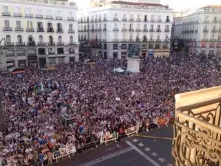 La Puerta del Sol de la capital se ha llenado por completo sobre las 21 horas de este domingo, momento en el que el Real Madrid, que ayer se coronó campeón de la Champions League en Lisboa, ha llegado a la Real Casa de Correos, donde le ha recibido el presidente de la Comunidad de Madrid, Ignacio González.