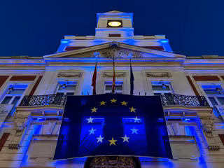 La Comunidad de Madrid luce desde este lunes la bandera de la Unión Europea --fondo azul con 12 estrellas amarillas dispuestas en círculo-- en la fachada principal de la Real Casa de Correos, donde permanecerá hasta el sábado para conmemorar el Día de Europa, que se celebra cada 9 de mayo.