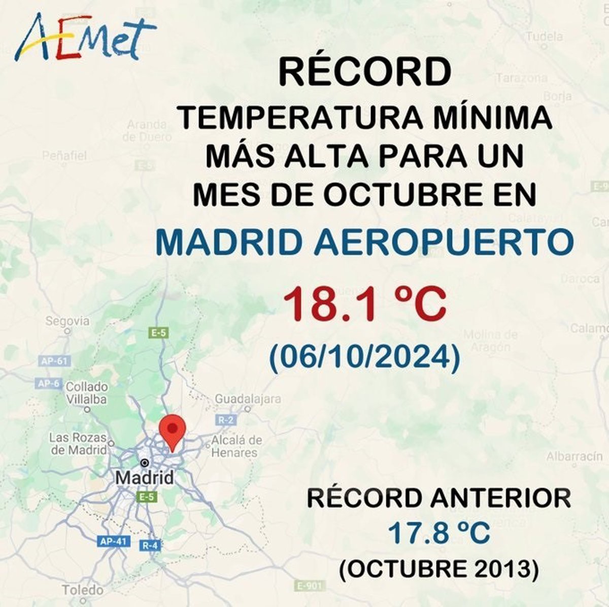 Concretamente, en la madrugada del día 6 se anotó una temperatura mínima de 18,1 grados centígrados en la estación meteorología situada en el aeropuerto Adolfo Suárez Madrid-Barajas. El récord anterior eran 17,8 grados y estaba vigente desde el año 2013.