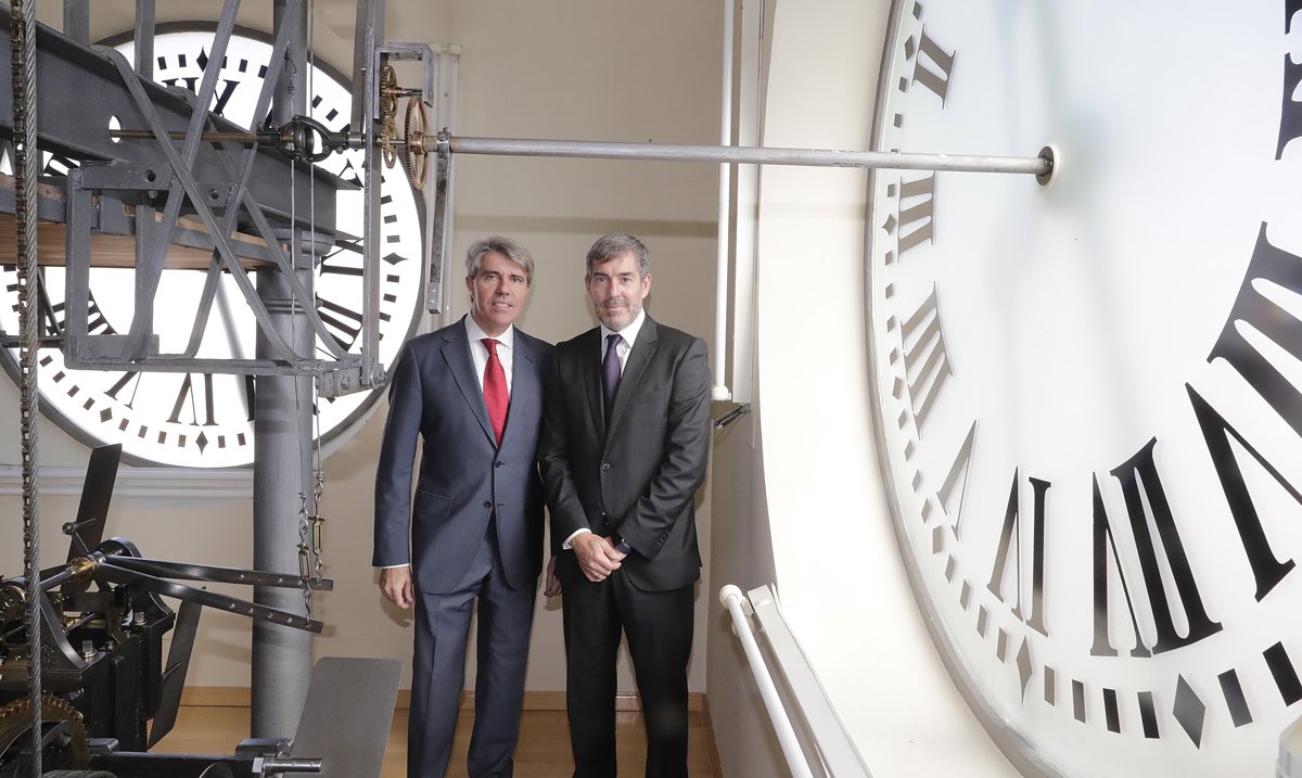 El presidente de Canarias, Fernando Clavijo, y el presidente de la Comunidad de Madrid, Ángel Garrido, han anunciado este viernes que las campanadas de Fin de Año de Canarias se darán por primera vez desde la Puerta del Sol de la capital, donde sonarán primero a las 00.00 horas en horario peninsular y, una hora después, a las 00.00 horas en horario canario.