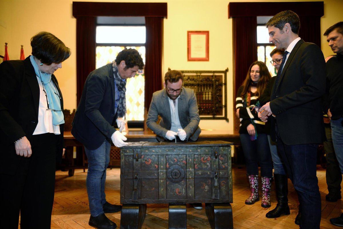 El alcalde de Alcalá de Henares, Javier Rodríguez Palacios, y la concejal de Patrimonio, Olga García, han presentado este viernes la restauración del arca de caudales del Ayuntamiento, perteneciente a la colección municipal de la segunda parte del siglo XVI.