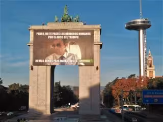 Con motivo del Día Mundial de los Derechos Humanos, la ONG ecologista ha desplegado la pancarta, que mostraba una imagen de Sánchez con gafas de sol y las frases "Pedro, no te pases los derechos humanos por el arco de triunfo. No más armas para matar civiles". Hasta el lugar se han acercado agentes de la Policía Nacional y Municipal de Madrid.