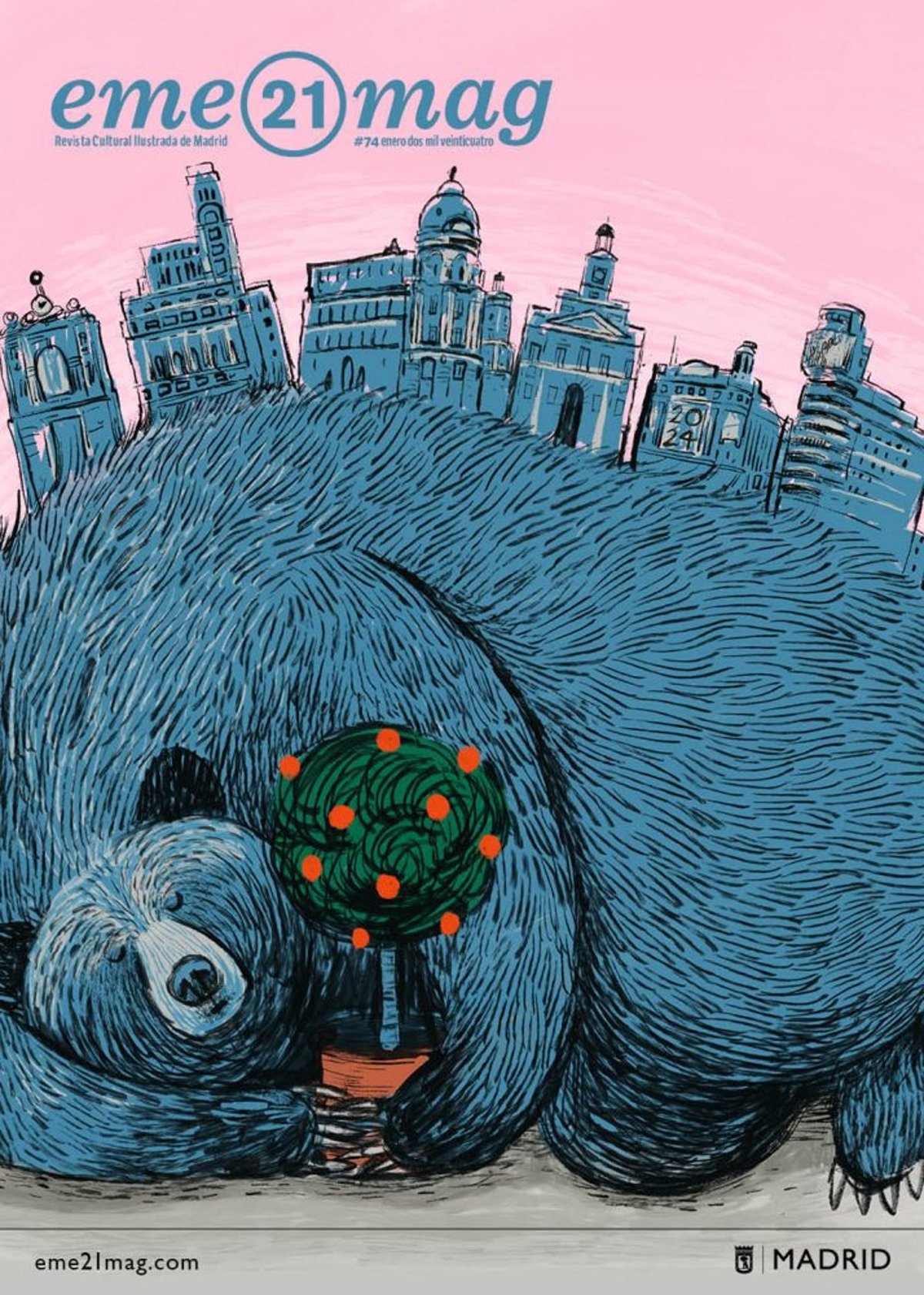 La revista ilustrada del Área de Cultura, Turismo y Deporte, eme21mag, dedica su primera portada de 2024 al Oso y el Madroño, con una interpretación del símbolo de Madrid a manos de la ilustradora Mar Ferrero.