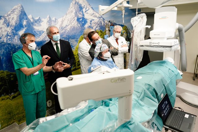 El consejero de Sanidad, Enrique Ruiz Escudero, ha visitado este lunes este hospital público de la capital para comprobar el funcionamiento de esta tecnología, que se emplea para realizar angioplastias e implantes de stents en las arterias coronarias, intervenciones mínimamente invasivas de reparación con catéter que se realizan en pacientes con angina de pecho o infarto de miocardio.