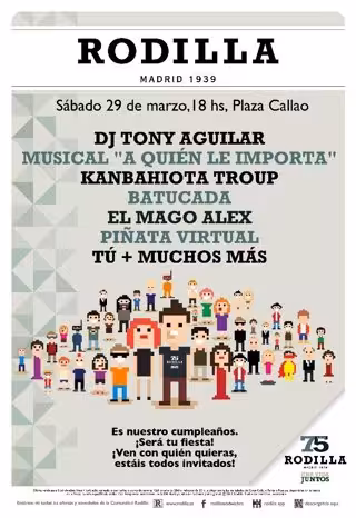 La cadena de restaurantes Rodilla celebrará este 29 de marzo, a partir de las 18 horas, su 75 aniversario con un evento musical en la Plaza de Callao que contará con la presentación del DJ y presentador Tony Aguilar y la presencia del musical 'A quién le importa', entre otras iniciativas.