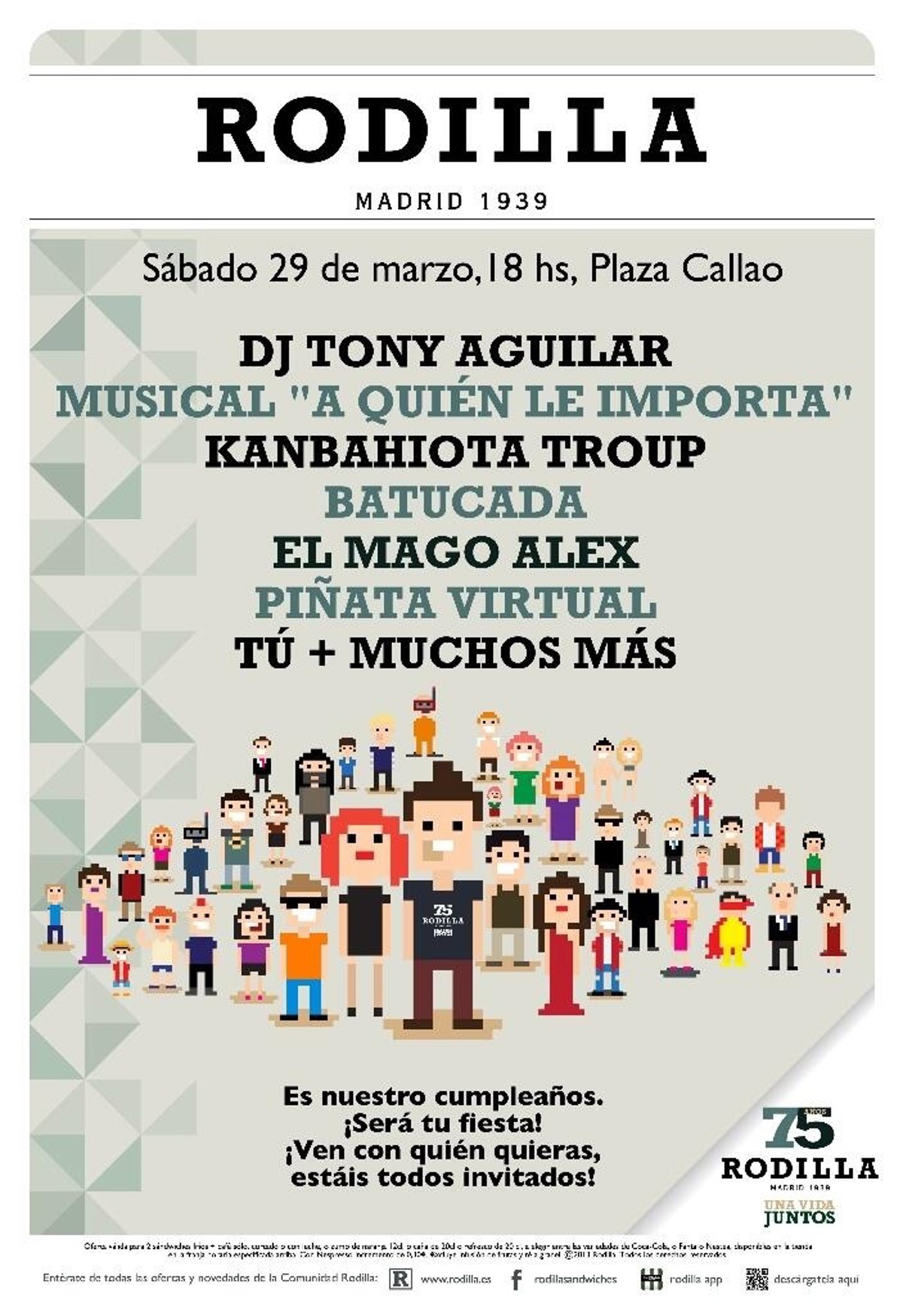 La cadena de restaurantes Rodilla celebrará el próximo 29 de marzo, a partir de las 18 horas, su 75 aniversario con un evento musical en la Plaza de Callao que contará con la presentación del DJ y presentador Tony Aguilar y la presencia del musical 'A quién le importa', entre otras iniciativas.