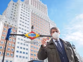 El consejero de Transportes, Ángel Garrido, muestra el cambio del rombo de la estación de Plaza de España, que ahora luce los colores de la bandera nacional - COMUNIDAD DE MADRID