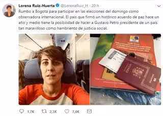 Ruiz-Huerta ha sido expulsado de la Misión Internacional tras escribir ayer un tuit señalando que se dirigía a Bogotá como observadora internacional de los comicios del domingo y que Colombia "tras un histórico acuerdo de paz hace un año y medio tiene la posibilidad de hacer a Gustavo Petro presidente de un país tan maravilloso como hambriento de justicia social".