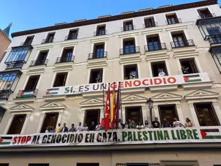 El juzgado de lo Contencioso-Administrativo 18 de Madrid estimaba el pasado viernes la medida cautelarísima de Más Madrid y suspendía la retirada de las dos pancartas propalestinas de los balcones del Edificio de Grupos Municipales.
