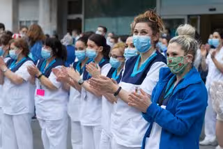 Varios sanitarios aplauden en agradecimiento por el homenaje a los Sanitarios del Hospital Fundación Jiménez Díaz - Joaquin Corchero / Europa Press