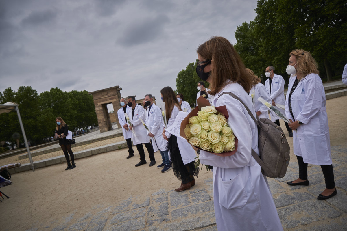 Decenas de personas, convocadas por la Asociación de Médicos y Titulados Superiores de Madrid (Amyts), han homenajeado este sábado al más de un centenar de médicos fallecidos en España en el ejercicio de su profesión durante la pandemia de la Covid-19.