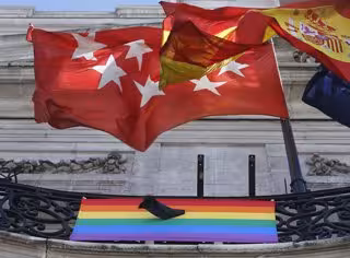La Comunidad de Madrid ha instalado la bandera LGTBI (Lesbianas, Gays, Bisexuales, Transexuales e Intersexuales) con crespón negro en la fachada de la Real Casa de Correos, como homenaje a las víctimas del atentado que ha contado la vida a medio centenar de personas en Orlando (EE UU).
