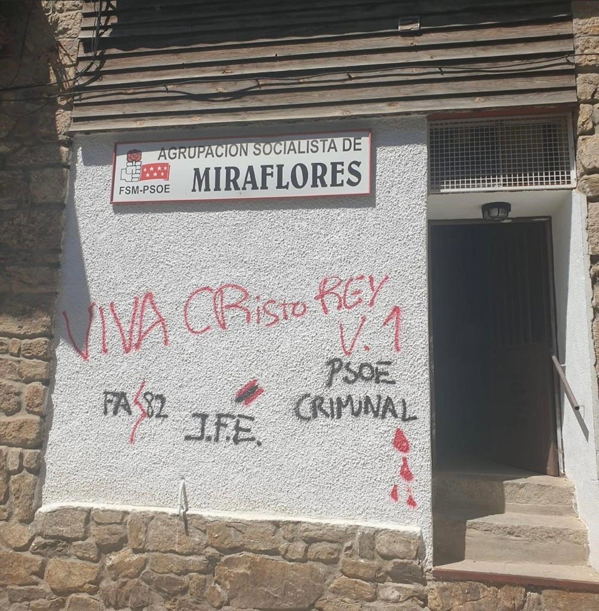 La sede del PSOE de Miraflores de la Sierra ha aparecido hace unos días con pintadas fascistas en su fachada en las que se puede leer "¡Viva cristo rey!", "PSOE criminal", 'J.F.E' (Juventudes Falangistas de España).