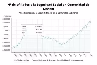 La Seguridad Social ganó de media en abril un total de 12.774 cotizantes en la Comunidad de Madrid, lo que supone un incremento del 0,40 por ciento con relación al mes anterior, ha informado este lunes el Ministerio de Trabajo, Migraciones y Seguridad Social.
