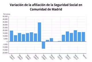 La Seguridad Social ganó de media en marzo un total de 17.168 cotizantes en la Comunidad de Madrid, lo que supone un incremento del 0,54 por ciento con relación al mes anterior, ha informado este martes el Ministerio de Trabajo, Migraciones y Seguridad SOcial.