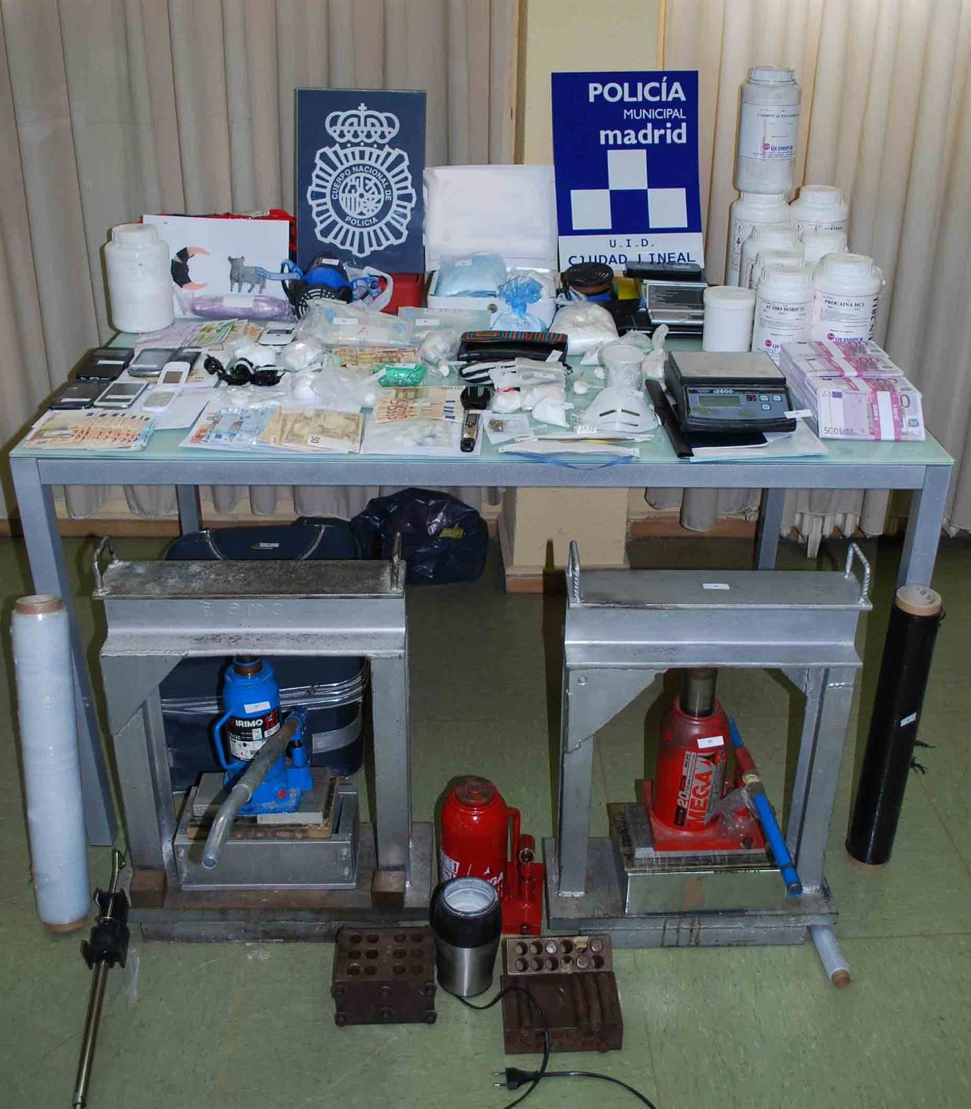 Tras diversas gestiones y la detención de los primeros miembros de la organización, los registros efectuados bajo orden judicial en dos domicilios permitieron localizar 2,7 kilogramos de cocaína, 5 kilos de sustancia de corte, prensas con sus moldes, molinillos, máscaras, básculas de precisión, productos químicos y 10.000 euros en efectivo.