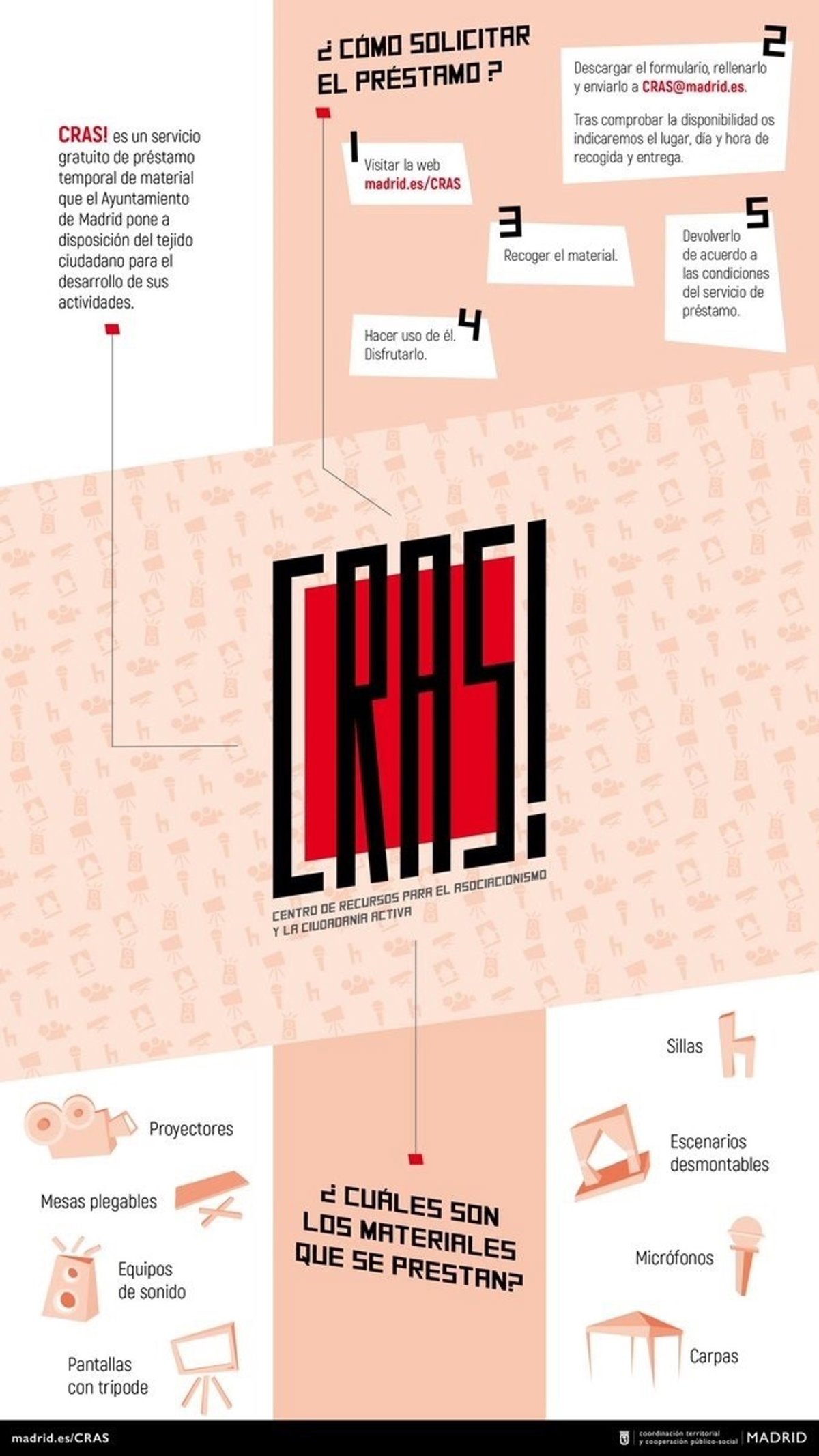 El material se solicita con un correo electrónico después de consultar qué está disponible en www.madrid.es/cras. Desde allí deben descargar el formulario, rellenarlo y enviarlo a la dirección electrónica cras@madrid.es.