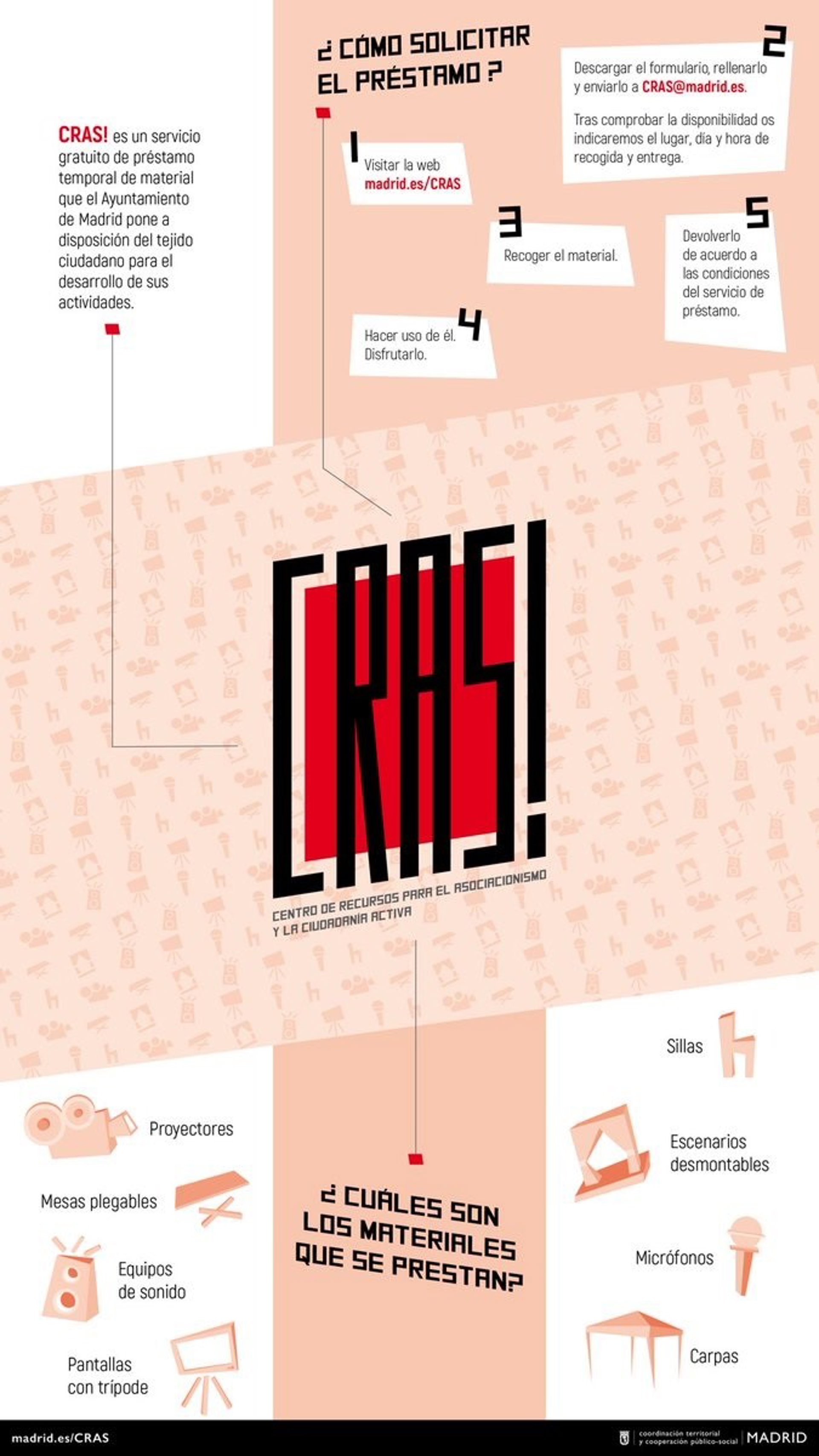 Los servicios de CRAS! pueden solicitarse no sólo por las entidades inscritas en el Registro Municipal sino también por los Foros Locales de los distritos. La solicitud debe realizarse con una antelación mínima de cinco días hábiles respecto a la fecha de recogida del material. El préstamo se hará por un máximo de cinco días naturales.