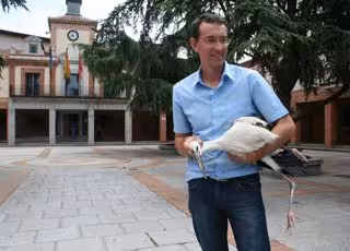 La Policía Local de Las Rozas y el veterinario municipal han recogido esta mañana a un polluelo de cigüeña que se había caído del nido de la torre de la iglesia de San Miguel, y que se había acodado, asustado, en la acera de la calle Galicia, con vuelta a la calle Pocito de San Roque.