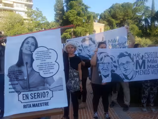 Otro de los carteles tenía a la candidata de Más Madrid Rita Maestre como protagonista, a quien se le espetaba que la ley que quiere promover la PAH "no permite que los alquileres suban un 300 por ciento" pero mientras se aprueba se pueden tomar medidas como "expropiación, realojos y vivienda social".